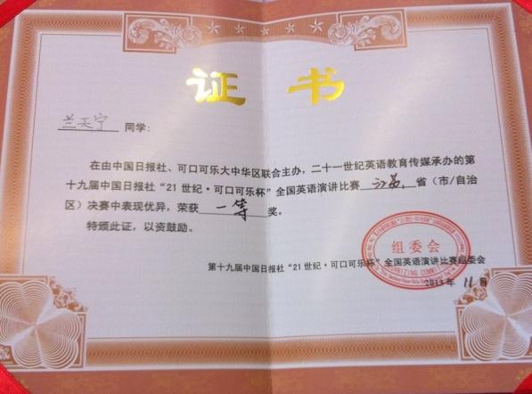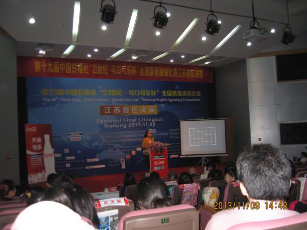 11月9日,第十九届中国日报社“21世纪•可口可乐杯”全国英语演讲比赛江苏赛区决赛在南京师范大学仙林校区举办,我院2012级本科生兰天宁获得一等奖,这是近年来我校非英语专业学生在同类赛事中获得的最佳成绩!