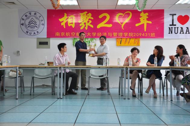 作为经济管理管理学院市场营销专业第二届毕业生,同学们十分感激母校和经管院的培养和教诲,集资赠送了“基业永盛宝瓶”,作为本次聚会的共同纪念。同学们还集思广益,作了一首以“南、航、经、管”为首字的藏头诗献给母校和经管院的老师:南楼月下马飞腾,航帆远行丰功成。经纬两仪文化洽,管弦长奏伟业恒。南航,将是209431班同学们永远的精神家园!