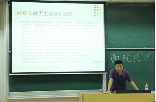 随后,王建立老师进行了题为《论文选题与文献综述》的学术讲座。从选题方法、注意事项,文献综述要点等三个方面深入浅出地介绍了如何选好题并撰写高质量的文献综述。王建立老师告诉大家,一篇高水平的学术论文选题来源,可以从兴趣或未解之谜入手,并要立足于创新性与可行性。一篇学术论文的选题,要关注其前世今生,及未来的发展变迁;不要过于投机取巧,华而不实;可以“小题大做”,以一个小问题牵扯出一个大的社会现象;也可以“大题小做”,在一个大的题目中专研其中一个领域。可以通过阅读相关领域权威期刊,关注诺贝尔经济学奖获得者或一些知名学者的研究方向及近期成果来确定研究范围。如果以后想成为一名学术性研究者,专一的关注一位知名人物的研究成果并去挖掘其隐藏的问题是一种不错的方法。