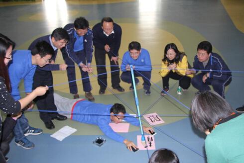 破冰环节之后,老师们被分编成两组——入乡随俗的“山里人家”队以及萌态十足的“棒棒哒”队。第一个拓展项目“驿站传书”,要求各队在对方间谍监控的情况下顺利完成信息的正确传输,考验了团队的集体智慧与创新思维。接着“生死电网”项目更是证明了集体力量的伟大与无穷。项目开始之前,多数老师认为这是一项不可能完成的任务,但是经过整个团队的群策群力,成员的果敢担当,全体老师在规定时间内顺利通过电网,现场气氛异常热烈,大家欢呼雀跃,掌声一片。