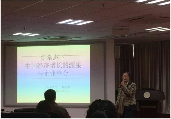 杨蕙馨教授以“中国经济高增长还能维持多久?”这个问题为切入点,和师生们探讨了过去30年中国经济高速增长的来源,接着分析了中国经济发生的变化,最后杨教授建议可以从技术、品牌、供应链商业关系、资本、政府等途径进行产业和企业的整合。