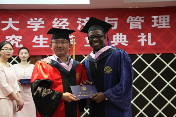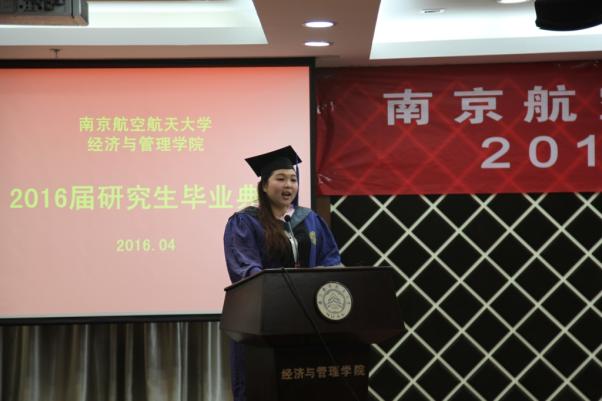 毕业典礼由学院党委副书记许静老师主持,党委书记焦宏图、院长周德群、副院长张卓分别向获得优秀硕士论文、校优秀毕业研究生、2015年国家奖学金获得者颁发了奖状。周德群院长与张卓副院长为毕业生们共同授予学位。随后,周德群院长向毕业生传达了他的殷切期望,在寄语中,周院长首先对经管学院2016届硕士研究生顺利毕业和获得硕士学位表示了由衷的祝贺。随后,他叮嘱毕业生们 “头脑中绷紧学习的弦”,养成终身学习的习惯,注意自我提升;“手中握着理性的宝剑”,具备判断、分析、推理等能力;“眼中绽放着智慧的光芒”,勤于思考,明辨是非;“鼻子保持敏锐的嗅觉”,洞察发展趋势,与时俱进;“耳朵能听见多方声音,尤其是逆耳忠言”;“心中常怀祖国和人民”,以国家和人民的利益为先,不要太过计较个人得失;“血管里流淌着道德的血液”,守住底线,不为外界所浸染。周院长热情洋溢、语重心长的讲话博得同学们阵阵热烈的掌声。