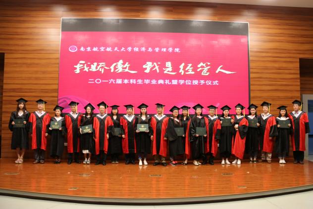 感人肺腑的毕业典礼后进行了庄重的学位授予仪式,仪式由学院党委副书记许静主持,学院院长周德群,教务处副处长朱建军,副院长张卓、王英、周鹏,管工系教授马静,工商系教授陈万明、王子龙,经济系主任邓晶、教授江可申,在学术权杖见证下,配合主持人一一念出的学生名字,分别给所有毕业生授予了学位证书。