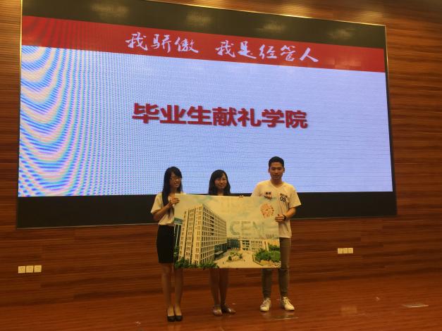 随后毕业生代表团总支书记夏婧雯和中心组组长冯颖杰为学院送上了毕业生们精心准备的礼物,以学院楼为背景,用全年级同学的车票拼成的0912爱CEM字样的大照片,焦宏图书记代表学院接受了毕业生的献礼并表示寄存了大家的车票,希望大家常回来看看。之后,一段饱含老师们深情的视频更是激发了学生们的泪腺,深受学生喜爱的老师们为大家送上祝福,希望大家迈好社会第一步,走好人生每一步,努力工作成就一番事业。