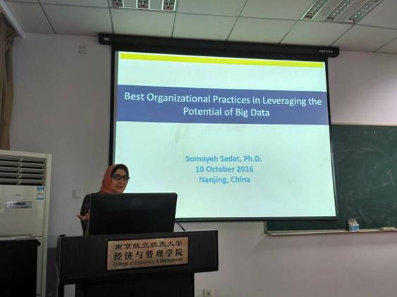 2016年10月10日下午15:00至16:00在东区Betway体育西汉姆联大楼704,TarbiatModares大学 的Somayeh Sadat教授受我院智能决策与风险分析研究所的邀请,作了题为“Best Organizational Practices in Leveraging the Potential of Big Data”的报告。经管学院的老师以及学生积极地参加了此次报告。
