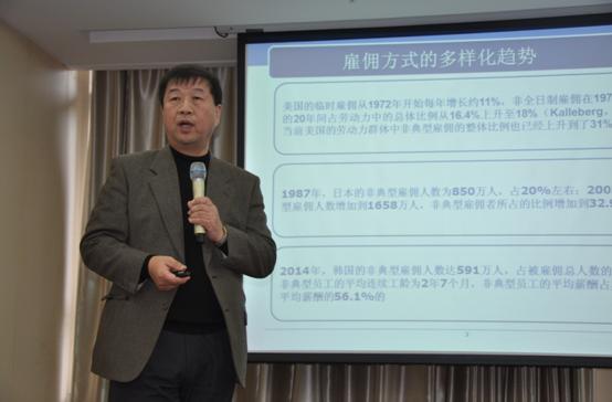 首先,南开大学商学院崔勋教授带来了关于“雇用方式多样化与人力资源管理”的学术报告。崔教授从典型雇佣和非典型雇佣角度引出雇佣方式多元化,重点剖析了非典型雇佣方式的选择动因、非典型雇佣方式的积极效果和消极效果、典型雇佣与非典型雇佣方式的互动效果、雇佣方式与人力资源管理的整合型、分离型、忽略型三种类型,以此为基础,从个体、群体、组织三个层面对雇用方式多样化的人力资源管理提出整体思考。