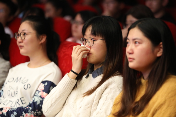 报告会以短片《孤岛32年》开始,短片中描述了王继才夫妇在曾经无电、无水、无居民的孤岛上,克服常人难以想象的困难,守卫国土32年的感人事迹。十分钟的短片深深的打动了在场的每一位师生,也将报告会现场的情绪引发到第一个高点。短片后,王志国身着军装,和大家分享了父亲王继才、母亲王仕花的守岛故事。