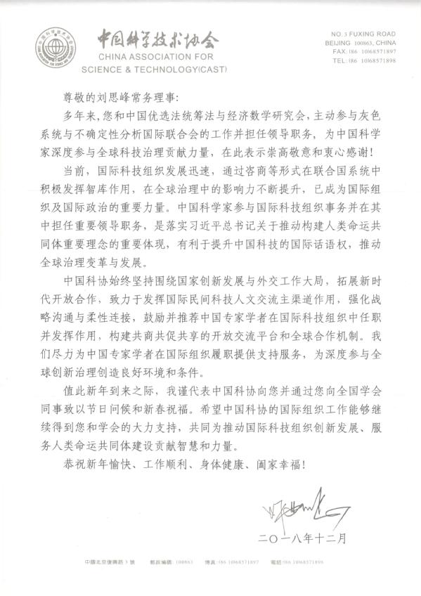 日前,中国科协党组书记、常务副主席、书记处第一书记怀进鹏院士给我校刘思峰教授来信祝贺新年,他在信中充分肯定和赞赏我校刘思峰教授及其团队“主动参与灰色系统与不确定性分析国际联合会的工作并担任领导职务,为中国科学家深度参与全球科技治理贡献力量”。
