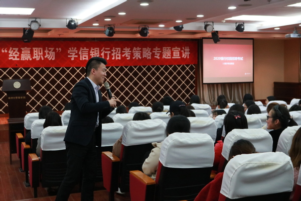银行是经管学生毕业后的主要就业方向,为了提高学生的行业认知,提升就业竞争力,3月12日晚上,学院邀请江苏省高校招生就业指导服务中心下属的学信学院教学研究院副院长梅高翔来我院开展了主题为“2020届毕业生银行招考策略”的宣讲会。
