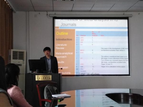 2019年3月29日下午,西安电子科技大学牟健老师受我院信息管理与电子商务研究所邀请,在Betway体育西汉姆联706室做了题为“How to integrate meta-analysis and SEM to do IS research”的讲座。我院肖琳、刘丽丽、刘文龙、何昌清、宋连莲等教师及部分硕、博研究生现场聆听了牟老师的报告,本次学术讲座由肖琳老师主持。
