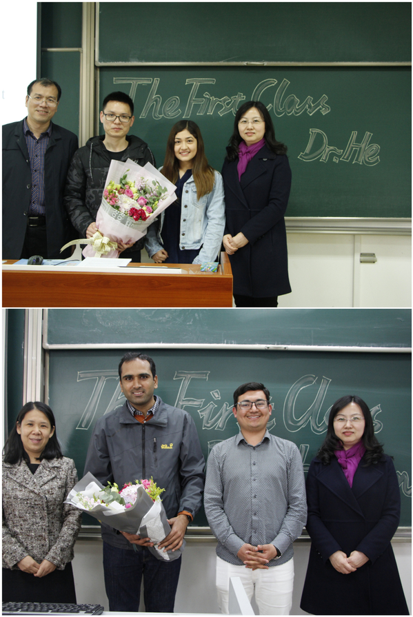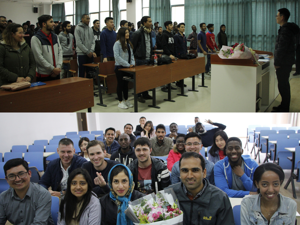 来自五湖四海的近百名留学生们共同见证了这一温馨而庄重的一幕。邓晶、王英分别为留学生们简要介绍了何昌清、HASHIM的学术经历和科研成果,希望同学们在国际化的课堂中学得其乐,学有所获。焦宏图则为两位新教师送上了学院精心准备的“金嗓子喉宝”和“经管定制优盘”,希望两位老师用“金嗓”打造“金课”,用U盘记录师生从游的美好点滴。