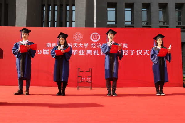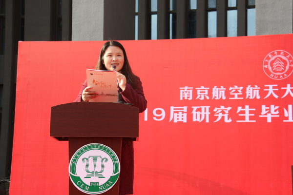 接下来,由王海谊等四名毕业生朗诵了一首由周德群等老师创作的《经管梦》。“强特色,争一流,经管梦,代相传”,在四位同学的朗诵声中,回顾了Betway体育西汉姆联建院35年来从无到有、由弱变强的发展历程,激发了同学们爱校荣院的感情,最后全体毕业生齐声喊出“我骄傲,我是南航经管人”,将毕业典礼推向了高潮。