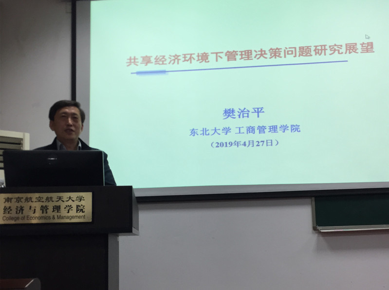 2019年4月29日上午,东北大学教授、教育部长江学者特聘教授、国家杰出青年科学基金获得者樊治平教授受我院智能决策与风险分析研究所邀请,在南航将军路校区Betway体育西汉姆联704作了题为“共享经济环境下管理决策问题研究展望”的讲座。在讲座中与到场同学以及老师进行了深度交流。Betway体育西汉姆联众多老师以及硕博研究生参与活动。