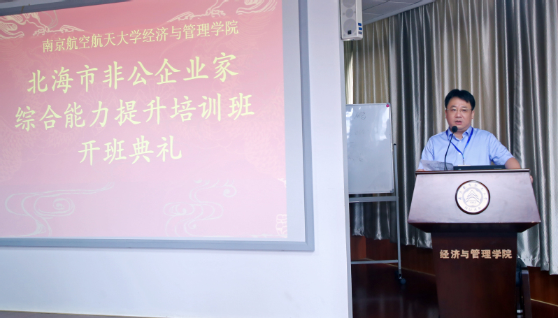 北海市市场监管局副局长、市非公办副主任李军在致辞中首先对此次培训地点选在“六朝古都、十朝都会”的南京,选在进入国家“双一流”建设序列的南航表示肯定,其次为大家简要介绍了培训班成班的历史缘由,希望大家充分珍惜这次学习机会,摆正位置,端正态度,平心静气,深入学习,练好内功,做到学有所思,学有所用,做大北海经济总量,用实实在在的数字回报组织,回报学校,回报社会。
