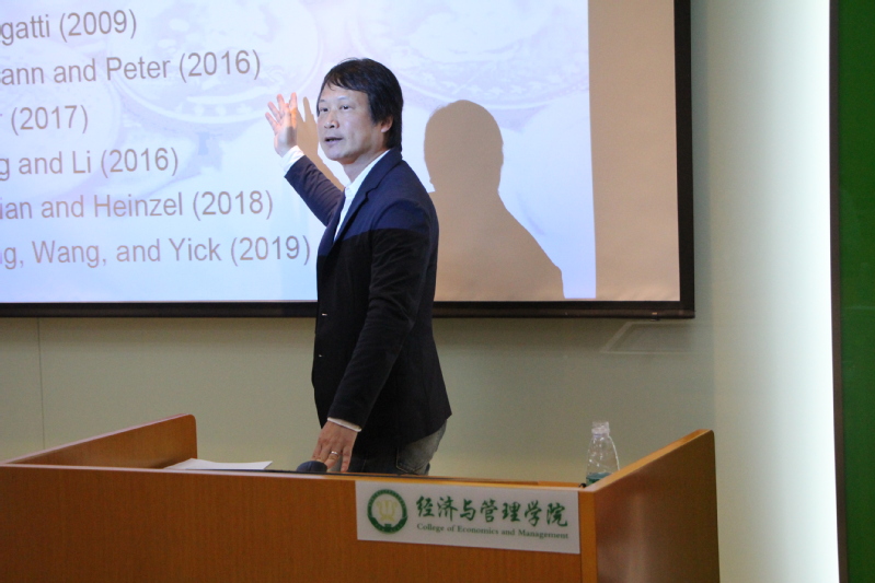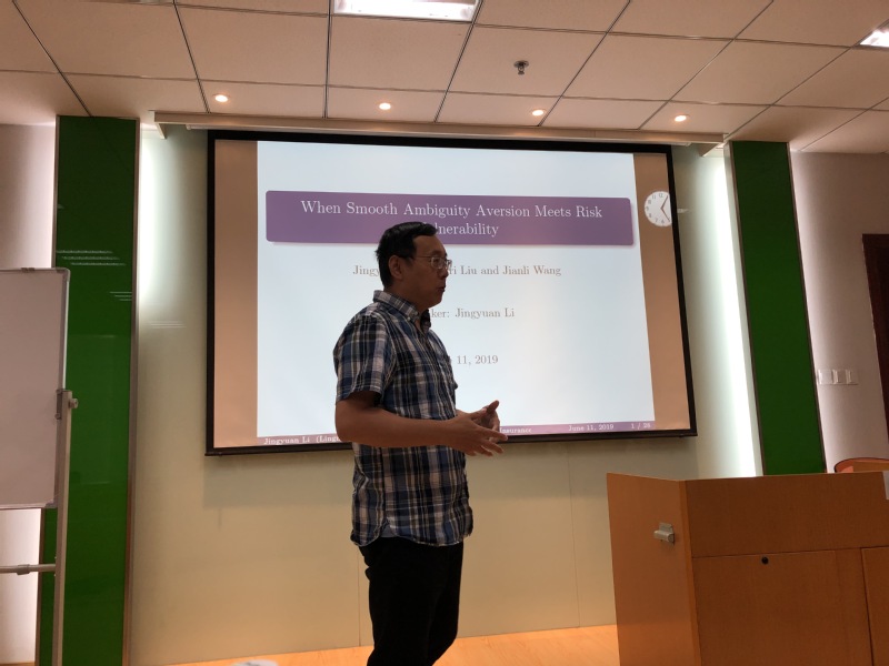 最后,教授Jingyuan Li分享了和新加坡国立大学博士Liu Dongri、经管学院副教授王建立等合作的关于投资者风险脆弱性和模糊厌恶偏好的最新工作论文“When Smooth Ambiguity Aversion Meets Risk Vulnerability”。Jingyuan Li目前是香港岭南大学金融与保险系主任,终身教授,曾担任《Journal of Risk and Insurance》等期刊编委,其研究成果已发表在《Journal of Economic Theory》,《Journal of Risk and Insurance》,《Journal of Mathematical Economics》、《Journal of Macroeconomics》等高水平期刊上。
