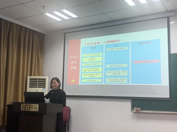 组织员袁颖就党支部标准化建设工作内容及要求进行了辅导,详细讲解了《中国共产党党员教育管理工作条例》、《中国共产党支部工作条例》等文件中的关键点,并结合学院制定的《经管学院关于入党积极分子发展、培养工作标准》、《经管学院学生党员考核评估办法》、《党员发展全流程台账》等制度文件,对党建基础业务能力进行了培训,明确了党员发展全流程台账工作中的责任主体与实施步骤。