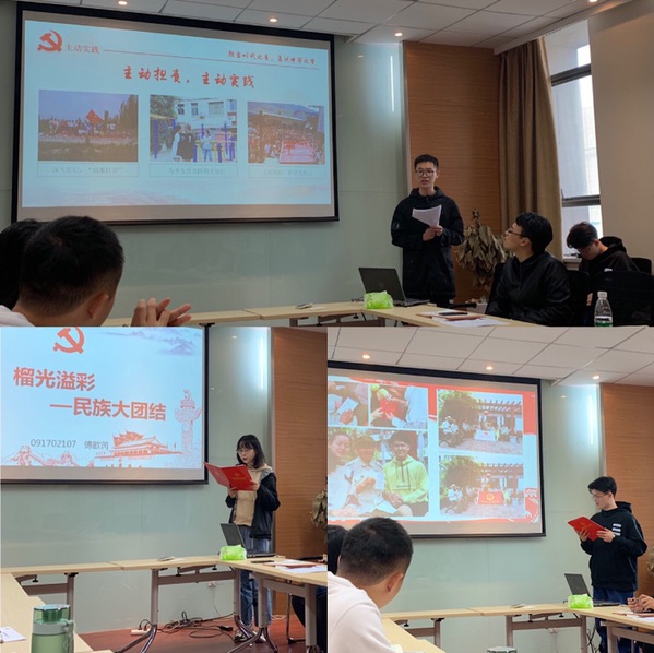 首先,支部成员傅歆芮、王康宇、高唯凯结合自身对“不忘初心、牢记使命”主题教育的学习体会和自身成长经历围绕“民族团结”“青年使命”“实践担当”三个关键词以新颖的形式、多维的视角开展了主题微党课。