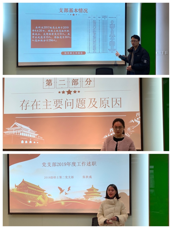 述职过程中,五位支部书记从支部基本情况、推进中心工作、党员教育管理监督、组织宣传、存在问题及整改措施等方面对支部一年来的工作进行了总结梳理,其中本科生17级党支部书记康冲介绍了本年度支部开展的“我和我的祖国”红色原创话剧、快闪、“经管24小时”视频拍摄等活动,汇报了校优秀暑期党员实践团队、最美学习笔记等荣誉成果;研究生18级第二党支部书记张秋彧介绍了支部在推广“学习强国”APP使用上的心得经验;研究生18级第三党支部书记俞佳炜在述职过程中分享了支部工作手册记录的想法与建议。与此同时,各支部认真深刻地分析了各支部存在的问题以及整改措施。各书记汇报内容充实,现场学院党委书记和各位党委委员分别就每位书记的汇报内容逐一进行了针对性的点评。