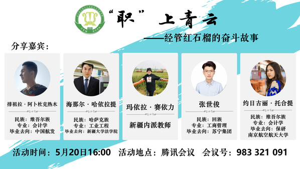 5月20日,Betway体育西汉姆联举办“‘职’上青云职业素质训练营——经管红石榴的奋斗故事”交流分享会,活动采取线上线下相结合的形式,邀请新疆内派教师玛依拉•赛依力以及16级优秀毕业生针对新疆籍少数民族学生的职业生涯规划进行专题分享, 40余名学生参与本次交流会。