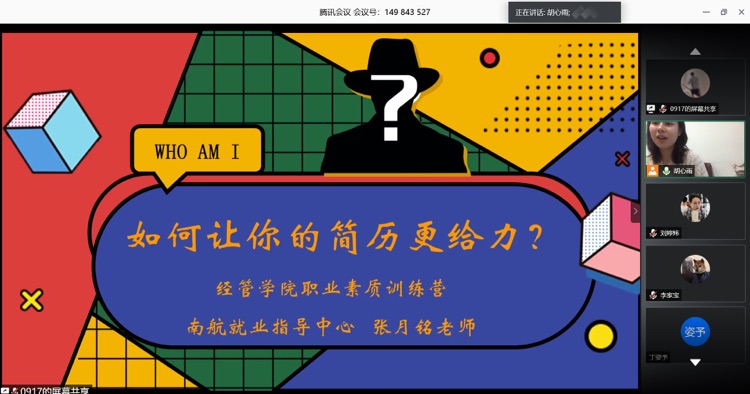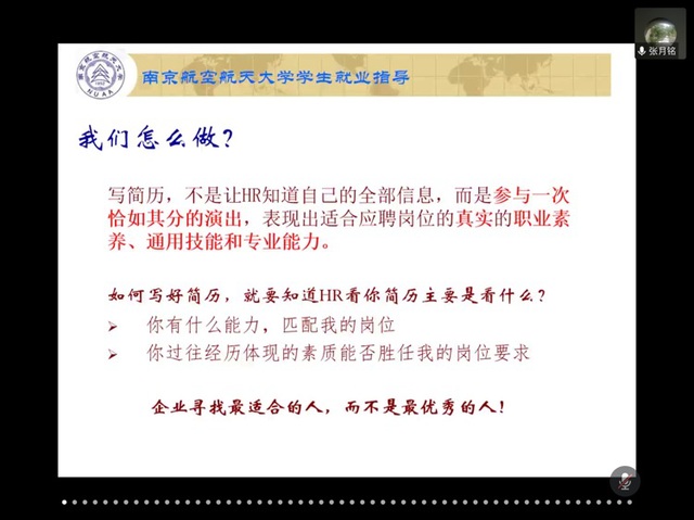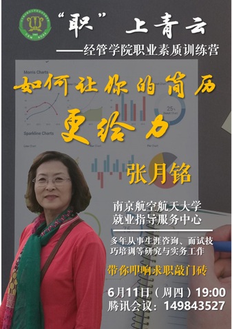 为落实学校党委关于“稳就业”的相关决策部署,切实提升学生就业竞争力,6月11日晚,Betway体育西汉姆联邀请南航就业创业指导服务中心张月铭老师开展“‘职’上青云:如何让你的简历更给力”线上专题讲座,辅导员胡心雨、刘婷炜以及200余名学生参加了本次活动。