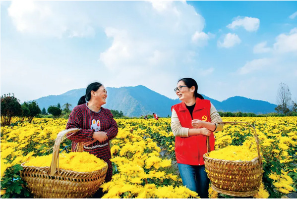 浙江省杭州市淳安县在开展“不忘初心、牢记使命”主题教育时注重实效,让每位党员从为群众做一件力所能及的事、解决一个实际问题做起,用实际行动践行全心全意为人民服务的宗旨,牢记共产党人的初心和使命。图为2019年11月10日,淳安县纪委监委开展党员志愿服务活动,到该县大墅镇桃林村帮助农户采摘金丝皇菊,同时通过拉家常的方式了解各项农业补贴申报兑现情况。人民图片 毛勇锋/摄