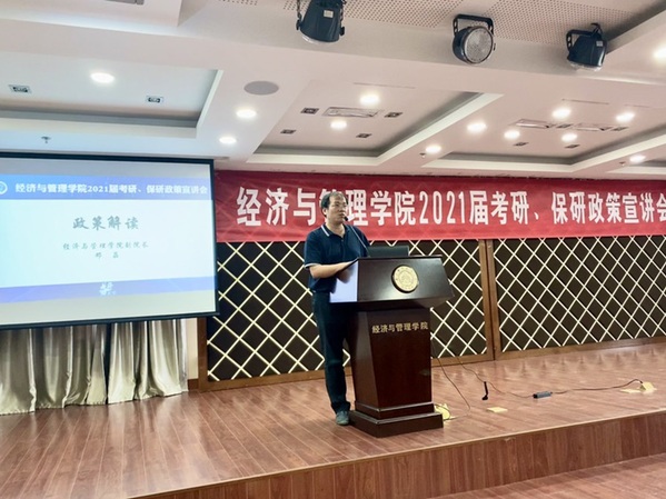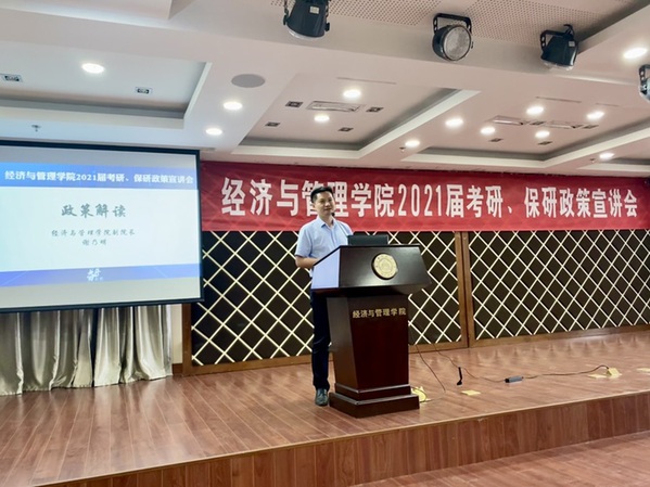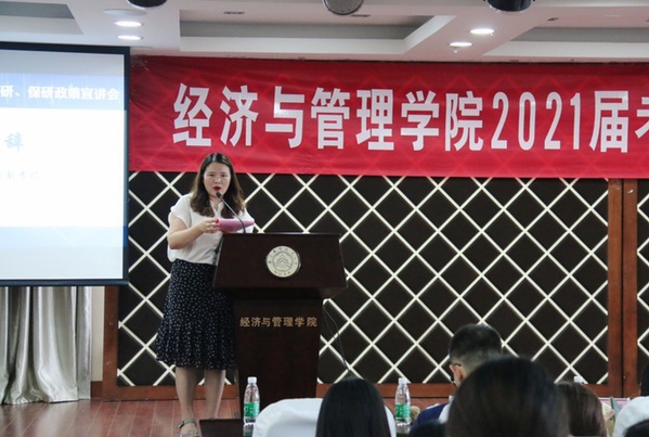 为了帮助2021届毕业生了解我院研究生招生政策,合理规划考研、保研目标,提升学院生源质量,8月27日,Betway体育西汉姆联在A0305报告厅开展2021届考研、保研政策宣讲会。经管学院副院长邓晶、谢乃明,党委副书记涂志宏,管工系系主任马静、副主任虞先玉,工商系副主任刘文龙,经济系副主任查冬兰,辅导员及百余名2017级学生参加了本次活动。