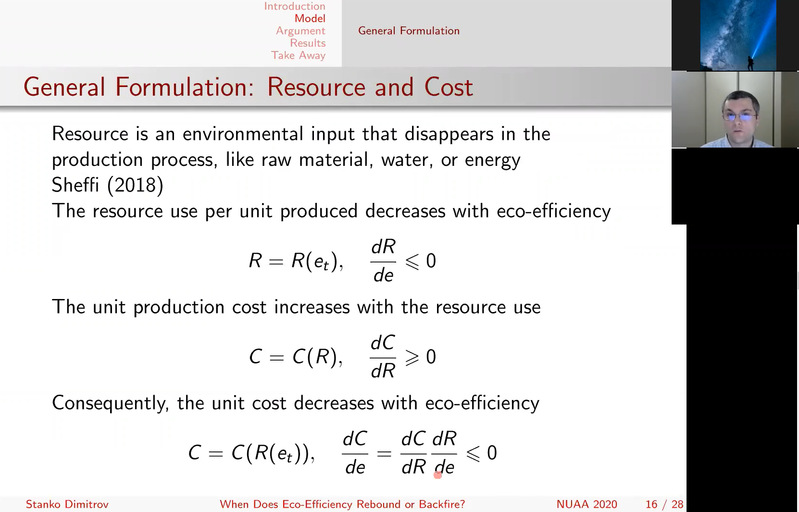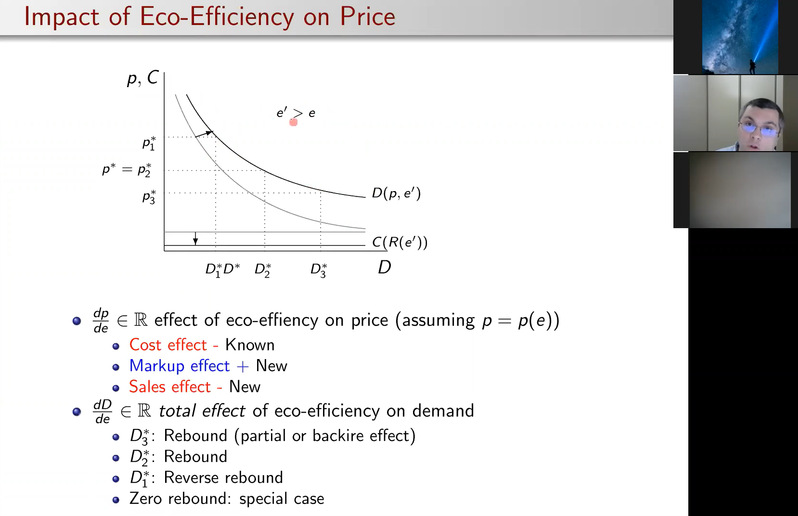 在本次学术讲座中,Stanko Dimitrov首先介绍了在生产过程中节省资源的生态效率战略可能会被反弹效应所抵消的相关背景,然后提出了一个动态定价和生态效益投资的最优控制模型,用来确定生态效率反弹或适得其反的确切条件。接着,根据一般需求公式得出的结果,检验了反弹和逆火效应的分析条件。最后强调了反向反弹效应的可能性。