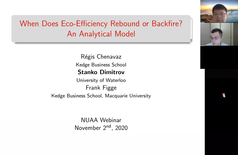 11月2日上午,加拿大滑铁卢大学教授Stanko Dimitrov受学院智能决策与风险分析研究所邀请,在ZOOM会议作了题为“When does eco-efficiency rebound or backfire? An analytical model”的讲座。我院教授徐海燕等教师及部分硕、博研究生线上参加了Stanko Dimitrov的报告分享,本次学术报告由徐海燕主持。