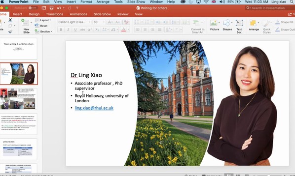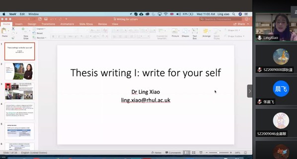 11月4日和11日晚上,伦敦大学皇家霍洛威学院副教授肖玲应经济系邀请,在腾讯会议作了关于英文论文写作的报告。我院副教授陆珩瑱等教师及部分硕、博研究生线上参加了肖玲的报告分享,本次短期课程由副教授陆珩瑱主持。