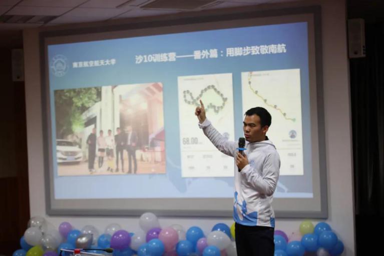 当天,南航沙9队长陆杨也来到了现场。在今年8月沙九赛场上,南航代表队获得了12名的好成绩,并捧回亚沙赛团体最高奖项“沙鸥奖”奖杯。在启动会现场,陆杨也分享了自己从“跑步小白”蜕变成“百公里神兽”的心路历程。