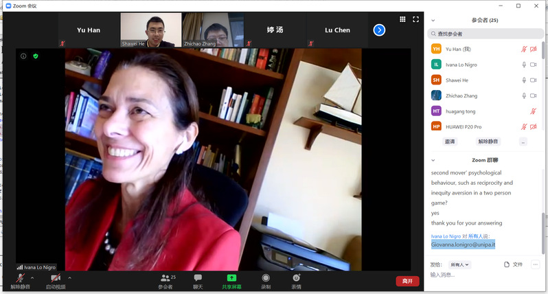 12月28日下午,意大利巴勒莫大学教授Giovanna Lo Nigro受学院智能决策与风险分析研究所邀请,在ZOOM会议作了题为“The interplay of reciprocity propensity and inequality aversion in two-person games”的学术报告。我院徐海燕教授、何沙玮副教授等教师及部分硕、博研究生线上参加了Giovanna Lo Nigro的报告分享,本次学术报告由何沙玮主持。