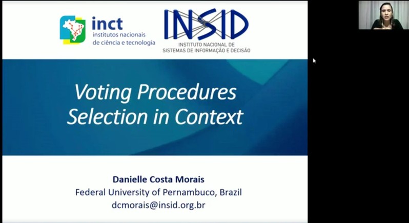 4月13日上午,巴西伯南布哥联邦大学教授Danielle Costa Morais受学院智能决策与风险分析研究所邀请,在腾讯会议作了题为“Voting Procedures Selection in Context”的学术报告。我院教授徐海燕等教师及部分硕、博研究生线上参加了Danielle Costa Morais的报告分享,本次学术报告由徐海燕主持。