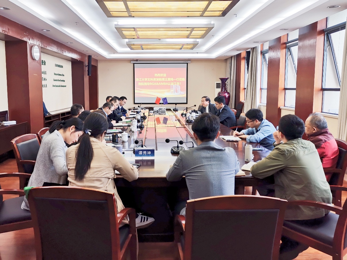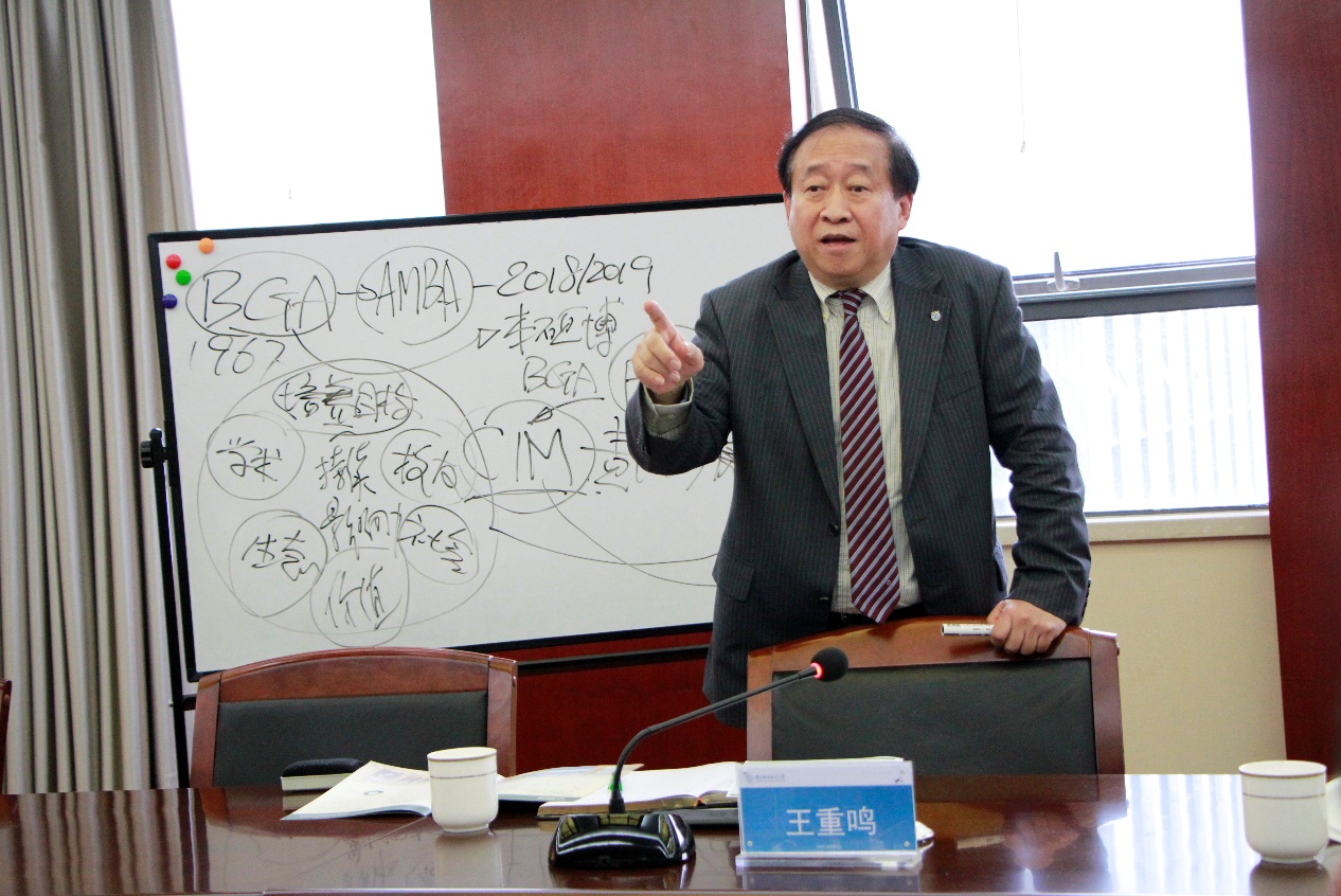 学校和学院领导对王重鸣教授的来访与指导表示热烈的欢迎和衷心的感谢。周德群院长介绍了学院的基本情况,谢嗣胜老师简要汇报了学院BGA认证工作的进展情况。