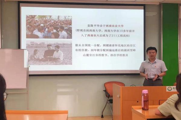 首先,许乃元围绕袁隆平院士的事迹开展主题党课。他从“天之骄子”“一波三折”“丰功伟绩”三个部分讲述了袁隆平院士的生平,重点介绍了杂交水稻历尽艰辛的科学研究过程,并从学术价值、现实意义、世界贡献三个维度,介绍了袁隆平院士在杂交水稻方面的系列成果以及深远影响。