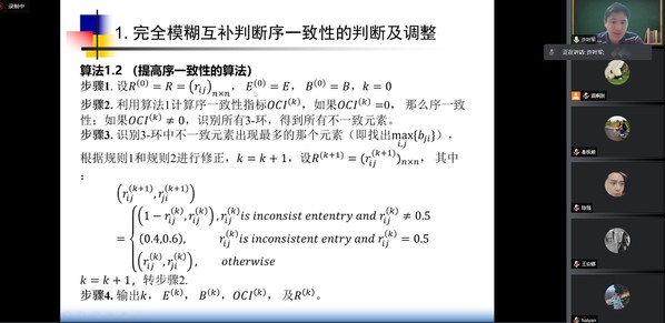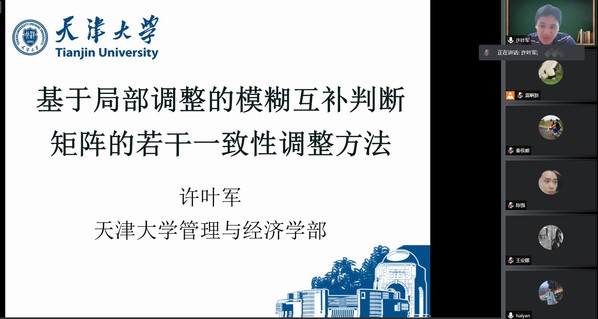 9月23日下午,天津大学教授许叶军受学院智能决策与风险分析研究所邀请,在腾讯会议作题为“基于局部调整的模糊互补判断矩阵的若干一致性调整方法”的讲座。我院教授徐海燕等教师及部分硕、博研究生线上参加许叶军的报告分享,本次学术报告由徐海燕主持。