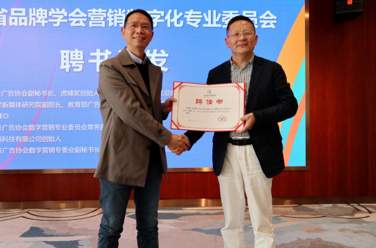 江苏省品牌学会副会长卜安洵为中国商务广告协会副秘书长、虎啸奖创始人、国际品牌观察杂志社总编辑陈徐彬颁发江苏省品牌学会营销数字化专业委员会会长聘书,陈徐彬为智子云CEO朱建秋、中国商务广告协会数字营销专业委员会常务副秘书长袁俊、兆腾科技创始人詹东宝颁发营销专委会副会长聘书,为中国商务广告协会数字营销专业委员会副秘书长、虎啸传媒战略运营副总裁姜微微颁营销专委会秘书长证书。