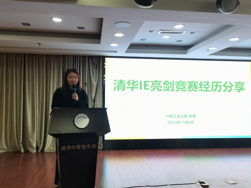 首先,来自大四的陈璐同学分享了参加清华IE亮剑竞赛的经历。首先,她向大家介绍了工业工程专业竞赛的概况和她所在团队研究的课题——“手电筒工厂设计”。她全面回顾了利用专业知识提出智能制造、学科综合应用、采用实物模型和数据仿真的生产创新点的过程。其次,与同学交流分享了参赛的感悟:实践过程既提升了分析问题和解决问题的能力,开阔了视野,加深了对工业工程专业的理解;又提高了团队协作能力,收获了志同道合的伙伴。最后,她鼓励低年级的同学们积极参加专业实习,在实践中提升自我,收获成长。