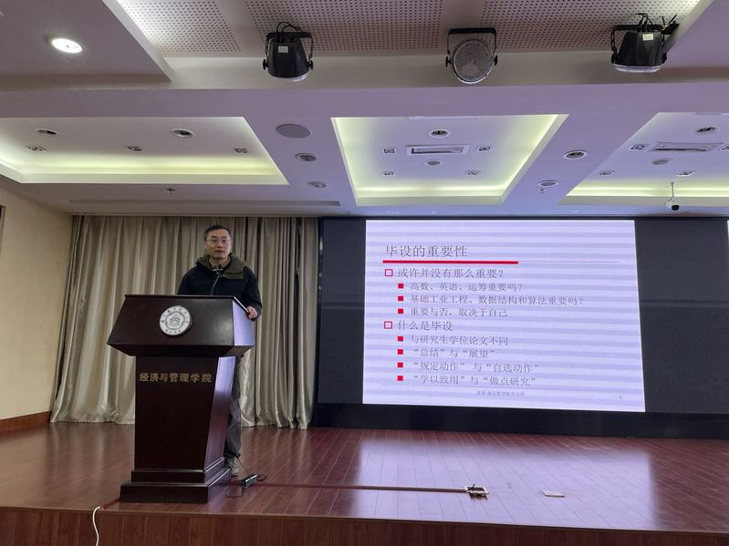 管工系教学督导沈洋老师介绍了毕设的意义以及在选题方面的注意事项,建议同学们和指导老师建立定期讨论的良好习惯。虞先玉老师介绍了作为优秀毕业论文指导老师在指导过程中的经验和心得体会。虞老师建议同学们提前准备,勤于思考,多参加相关老师课题组的定期讨论,把功夫下在平时。