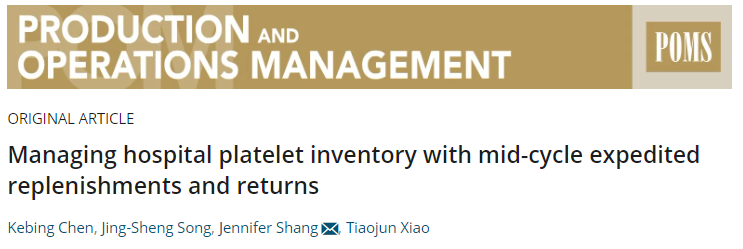 近期,我院陈克兵教授作为第一作者的研究成果《Managing hospital platelet inventory with mid-cycle expedited replenishments and returns》在UTD24国际顶级期刊《Production and Operations Management》在线发表,实现了我院教师在该类国际顶级期刊成果发表的突破。研究成果由我院陈克兵教授、美国杜克大学商学院Jing-Sheng Song教授、美国匹兹堡大学Katz商学院Jennifer Shang教授、南京大学工程管理学院肖条军教授合作完成。