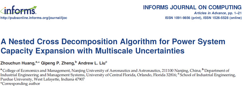近日,Betway体育西汉姆联青年教师黄周春作为第一作者在UTD24国际顶级期刊《INFORMS Journal on Computing》上在线发表了题为《A Nested Cross Decomposition Algorithm for Power System Capacity Expansion with Multiscale Uncertainties》的学术论文。该论文由我院教师黄周春、美国中佛罗里达大学工业工程系Qipeng Phil Zheng副教授、美国普渡大学工业工程系Andrew Liu副教授合作完成。