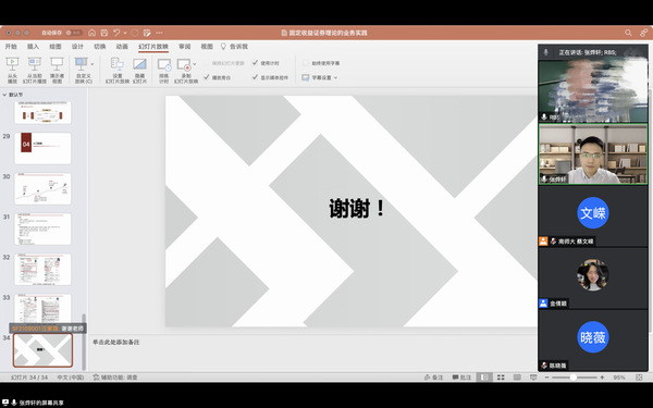 5月26日上午,中证信用增进股份有限公司业务副总裁张烨轩应金融研究所的邀请,通过腾讯会议为我院师生作了题为“固定收益证券理论的业务实践”的报告,本次报告由金融研究所的金倩颖副教授主持,本硕博80余名同学参加了此次讲座。
