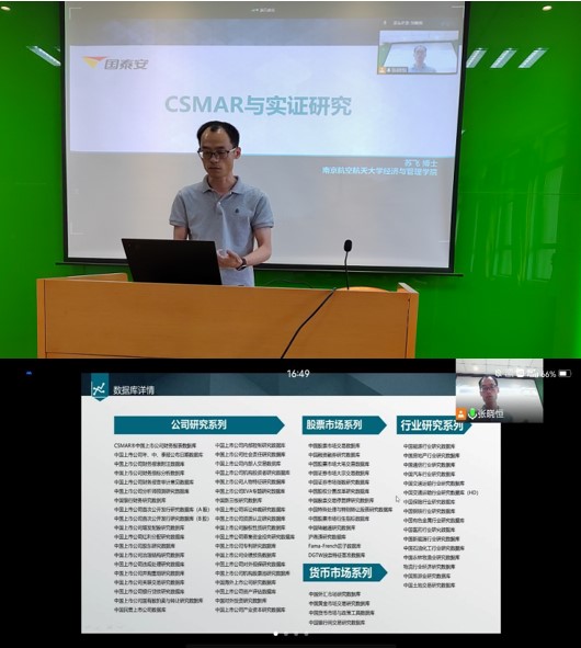 活动下半场,苏飞以“CSMAR数据库与实证研究”为题进行了经验分享。他简要介绍了国内外各大金融类数据库的特征和使用方法,并结合在CSMAR数据库企业工作的经历,鼓励同学们要多关注社会热点问题,利用数据库开展实证研究。