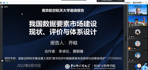 6月10日,中国科学院大学Betway体育西汉姆联教授乔晗应Betway体育西汉姆联人力资源管理研究所和江苏省人力资源发展研究基地的邀请,在线上(腾讯会议地址:996560802)为我院师生作了题为“我国数据要素市场建设现状、评价与体系设计”的精彩学术报告。本次报告由教授胡恩华主持,教师李媛、何昌清、蔡静雯以及博士生和硕士生参加了此次学术报告活动。