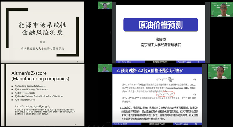 8月14日,Betway体育西汉姆联张旋副教授围绕“能源市场系统性金融风险测度”主题进行授课,分别从单个公司信用风险测度、联合违约风险测度和系统性风险测度三个维度,结合教学案例和经典论文,介绍了不同的风险测度模型及其相应的应用场景。南京理工大学Betway体育西汉姆联张耀杰副教授围绕“原油价格的预测”主题进行授课,分别从政府监管、企业管理和金融投资三个视角出发,基于经典原油价格预测模型和方法,分析了原油价格的预测对象、预测变量以及油价的影响因素,解读了原油价格预测的现实意义。