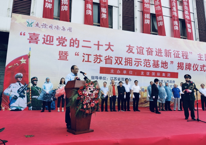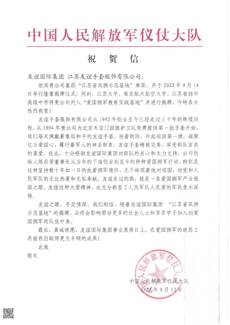 友谊国际集团被江苏省双拥办授予江苏省双拥示范基地,中国人民解放军仪仗大队专程为本次活动发来祝贺信。