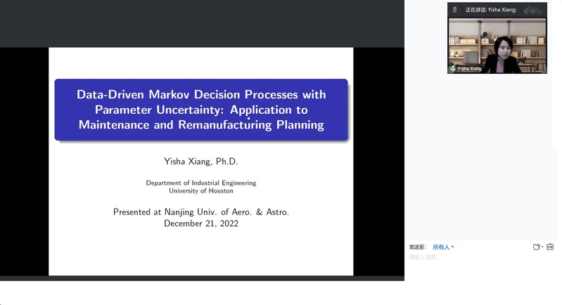 12月21日上午,休斯敦大学向一莎副教授受学院灰色系统研究所邀请,在腾讯会议作题为“数据驱动的带有参数不确定性的马尔科夫决策过程及其在运维和再制造计划中的应用”的学术讲座。我院教授刘思峰、谢乃明、米传民、副教授胡明礼、欧阳林寒、王俊杰等教师及部分硕、博研究生线上参加了向教授的报告分享,本次学术报告由谢乃明主持。