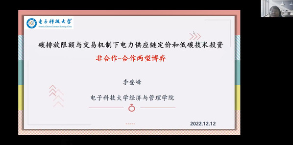 12月12日下午,长江学者特聘教授、电子科技大学Betway体育西汉姆联李登峰教授受学院智能决策与风险分析研究所邀请,在腾讯会议作题为“碳排放限额与交易机制下电力供应链定价和低碳技术投资非合作-合作两型博弈”的学术讲座。我院教授徐海燕、副教授高广鑫等教师及部分硕、博研究生线上参加了李登峰的报告分享,本次学术报告由徐海燕主持。