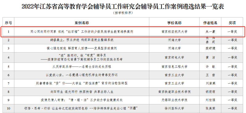 近日,江苏省高等教育学会辅导员工作研究委员会公布了2022年度辅导员工作案例遴选结果,我院辅导员朱一豪撰写的《同心同向同行同享 依托“红石榴”工作坊的少数民族学生教育培养案例》荣获江苏省辅导员工作案例评选一等奖。