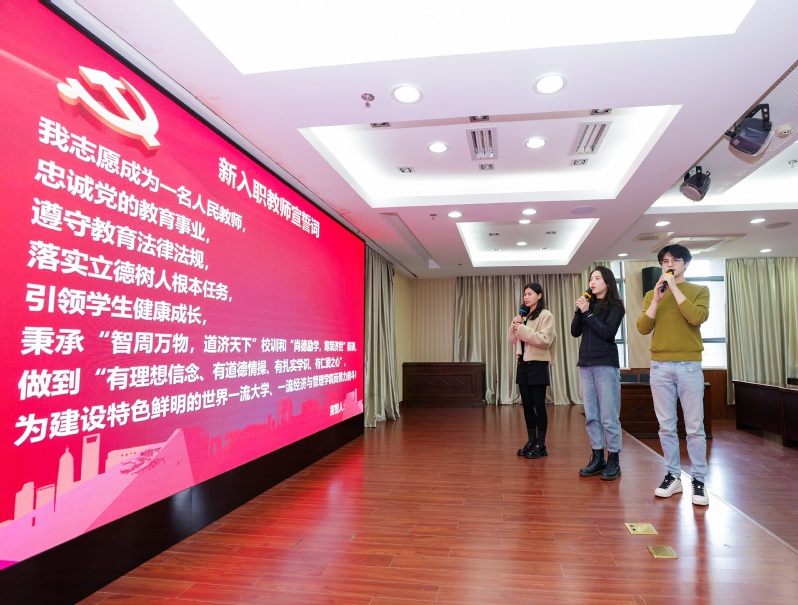在新进教职工入职仪式上,卓迪生、张玉旋、胡晓菲三位老师在全院老师的见证下庄严宣誓:将忠诚党的教育事业,落实立德树人根本任务,秉承“智周万物,道济天下”校训和“尚德励学,筹策济世”院训,做“四有”好老师,为建设特色鲜明的世界一流大学、一流Betway体育西汉姆联而努力奋斗!