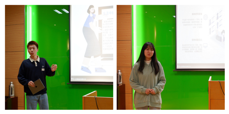 随后,大数据管理与应用班级李洋、常晶鑫两位同学以国家安全中的网络安全为切入点,揭秘日常生活中“抖音”等短视频平台根据浏览数据实现个性化精准推送的原理,警示大家信息安全无处不在,安全上网,注重保护个人信息,谨防陌生人诈骗。